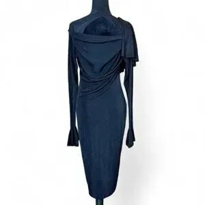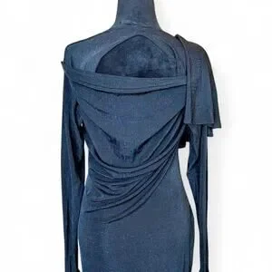 black midi dress asymmetrical draped dress cutout back fitted evening dress minimalist goth sleek modern chic bodycon stretch formal unique silhouette edgy elegant