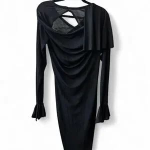 black midi dress with unique draped cutout back and asymmetrical layered shoulder detail. sleek fitted silhouette with subtle shimmer, minimalist statement piece perfect for evening or elevated goth looks