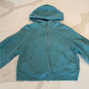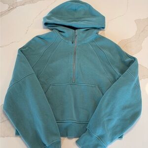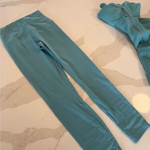 Coordinated hoodie and leggings in a soft aqua teal. Hoodie features a half-zip and kangaroo pocket. Matching high-waist leggings with smooth finish. Comfortable, casual and ready to wear. Scuba hoodie size 6 and align mid calf (25”) leggings size 4