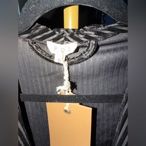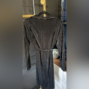 Elegant black wrap from POL. Subtle vertical textured stripes. Wrap-style tie at the waist for shape. Sleek neckline and refined finish.