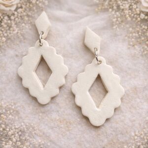 Lightweight cream geometric dangle earrings with a scalloped diamond shape. Designed for everyday wear and easy styling. The neutral cream color complements any outfit.