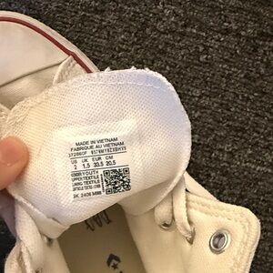 Classic kids' high-top Converse in white canvas. Red and black stripe detail on the midsole. Cushioned insole for everyday wear. Lace-up closure with metal eyelets.