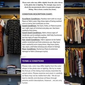 Please note that clothing items may fit differently due to Brand, Fit, Use or Prior customization. We strongly urge you to check the measurements above to guarantee proper fitting. This is from a smoke free home.