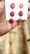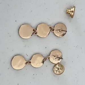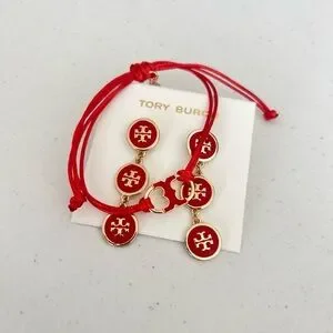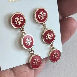 Three linked red enamel discs with signature Tory Burch logos. Polished gold-tone edges and connectors. Elegant, eye-catching drop silhouette. Versatile for day or evening wear.