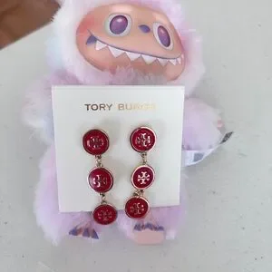 Tory Burch Gold-Tone Red Enamel Triple Drop Logo Earrings