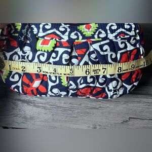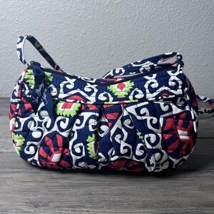 Add a vibrant pop of color to your wardrobe with this charming, retired Vera Bradley Frannie Crescent Crossbody bag in the Sun Valley pattern. This quilted cotton purse features a beautiful combination of navy blue, bright red, white, and lime green geometric and floral designs.