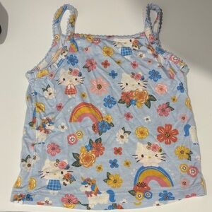 Light blue Hello Kitty camisole with colorful florals, rainbows, unicorns, and kitten faces. Soft printed cotton-look fabric and slim straps. Bright playful palette for everyday wear. Posh Peanut size XXS (2/3)
