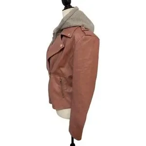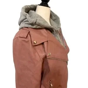 Channel edgy-chic vibes with this striking pink faux leather moto jacket featuring a stylish removable gray hoodie. Crafted for the modern woman, this jacket offers a flattering silhouette with classic moto detailing like zippered pockets and lapels, providing both fashion and function. The attached hoodie offers an unexpected layer of warmth and a casual contrast to the sleek faux leather, making it perfect for transitioning from a cool evening out to a relaxed weekend brunch.