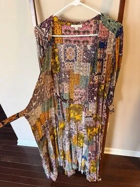 Bohemian patchwork midi dress in mustard, pink, green, and purple tones. Lightweight, flowy fabric with a flattering v-neck and wrap around style. Versatile style for daytime or evening wear. Easy to dress up or down.