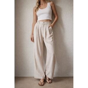 Free People pleated cotton trousers in a neutral beige with a subtle slub texture. These high-rise pants feature a tapered, slightly cropped leg with front pleating and an elasticized back waistband for a comfortable fit. Designed with functional side pockets and rear welt pockets, they offer a relaxed yet tailored aesthetic perfect for casual or professional wear.