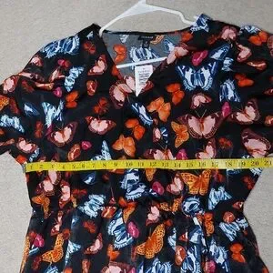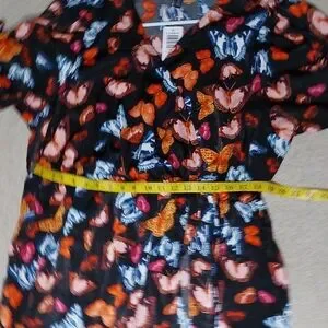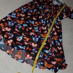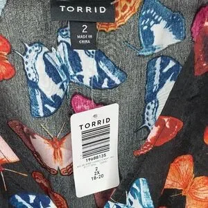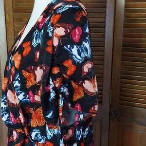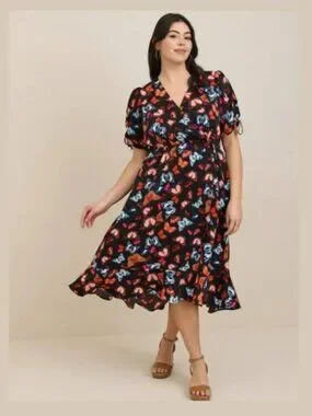 black, orange, blue, red, butterflies, ruffles, summer dress, sun dress, wrap dress, plus size midi dress, Torrid, travel, vacation, holiday, Mother's Day, Easter, cruise, garden party, tea party, feminine, spring, summer, fall, short sleeves, cocktails, date night, brunch, modest, conservative, lightweight, church, wedding guest dress, photoshoot, bridal shower, baby shower, modern, trendy, chiffon, multi-color,