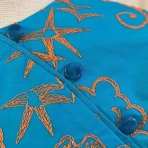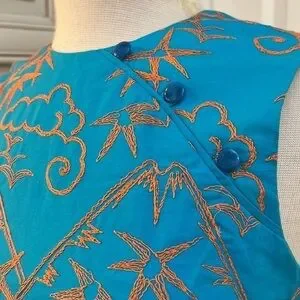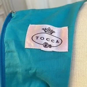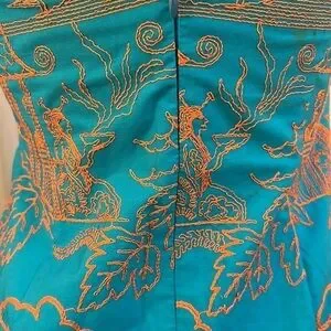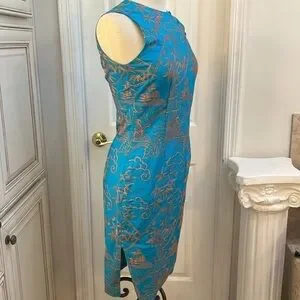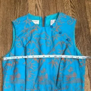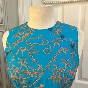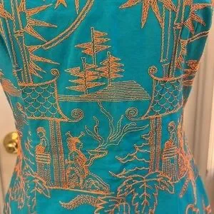 This gorgeous sheath dress is labeled with both Hartly Westwood and TOCCA tags. It is heavily embroidered with an Asian Geisha, landscape with suns, clouds and mountains with Geisha holding a steaming bowl. Amazing detail! Dress is 100% cotton. Size tag removed but I believe is size 4 as it did not zip all the way up my size 6 mannequin. Teeny rip at base of zipper, easily stitched.