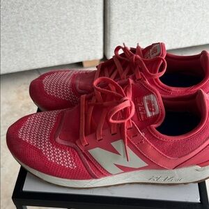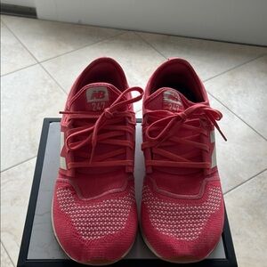 Women's New Balance low-top sneakers. Coral pink knit upper with subtle white logo accents. Lace-up closure for a secure fit. Lightweight and breathable design.
