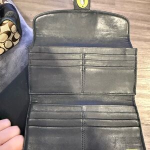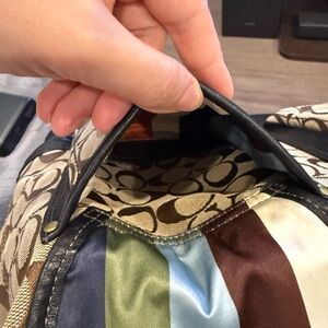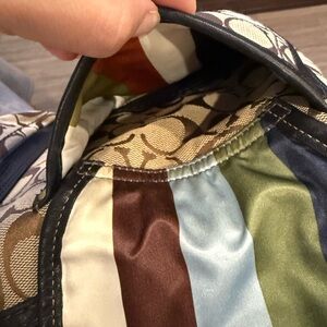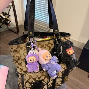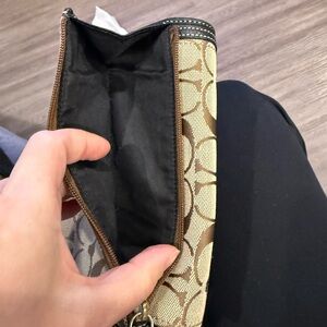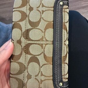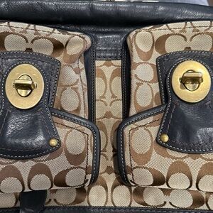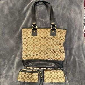 This Coach Legacy Tote is crafted from signature canvas with brown leather trim and features distinctive front turnlock pockets and gold-tone hardware. Tags included on bag and wristlet! Clean bag and wallets. Condition: bag good condition no tears!