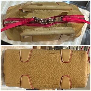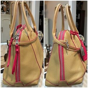 Pair of Coach satchels in pebbled tan leather. Bright pink trim and zipper accents. Top handles and polished hardware. Classic structured silhouette. Versatile for day or travel.