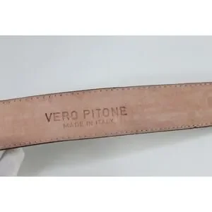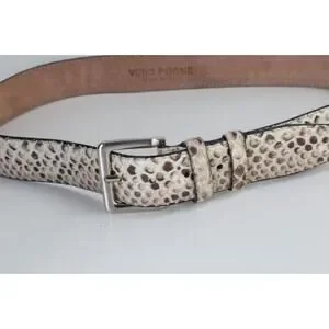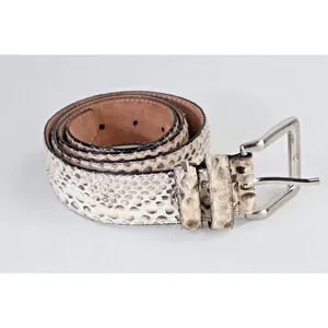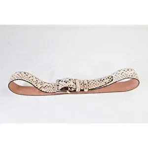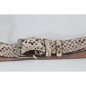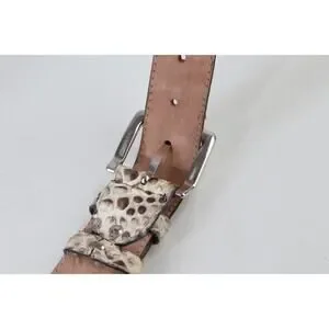 Add an exotic edge to your wardrobe with this stunning vintage genuine snakeskin belt. This piece features a beautiful natural scale pattern in shades of gray and white, complemented by a large, ornate silver-tone buckle that serves as a focal point. The interior is lined with smooth leather for durability and comfort, making it a perfect statement piece for cinching a dress or pairing with high-waisted denim.