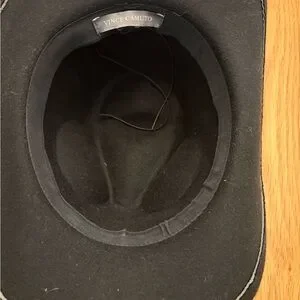 Classic Vince Camuto western-style felt hat. Features a decorative concho band. Structured crown and curved brim. Sleek black finish for versatile wear.