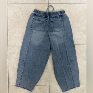 Relaxed-fit denim cropped jean with elastic waistband. Functional cargo pockets and visible panel stitching. Comfortable casual style for everyday wear.