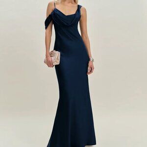 The Ronda Silk Dress from Reformation, a one-shoulder, maxi dress with an asymmetric, cowl neckline.