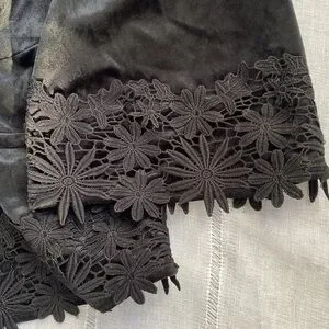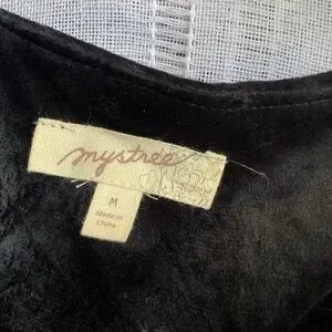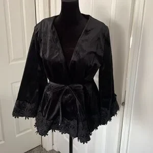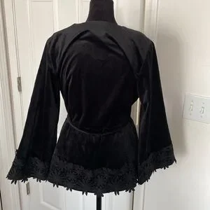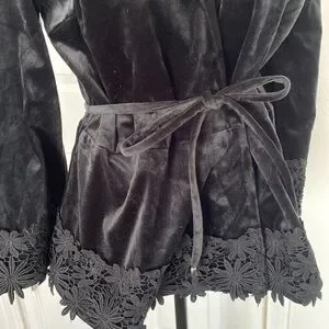 Mystree Black Velvet Wrap Jacket with floral embroidery. Size medium. Like new. Elegant wrap style jacket. Features floral lace embroidery trim on sleeves and hem. Perfect for a chic evening look. Soft!