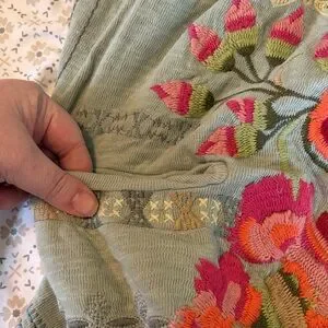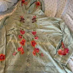 Beautiful brand new with tags Johnny Was Wysen Hooded Duster. I unfortunately have no way to measure this so apologies in advance. This sage-ish green background with brightly stitched flowers all over. Love love love