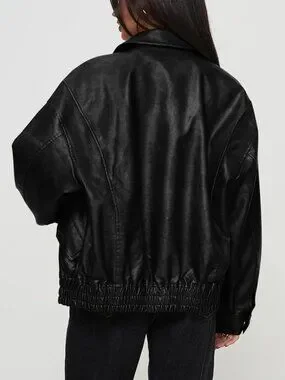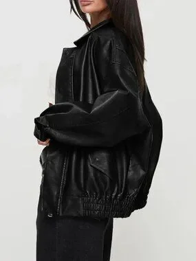 Women's Faux Leather Motorcycle Jacket Oversized Zip Up Winter Coat Black