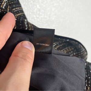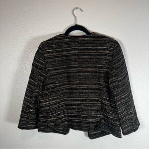 Tailored open-front jacket with metallic tweed texture. Subtle sequin and bead embellishments on the shoulders. Classic cropped silhouette for versatile layering. Polished look for work or evening events.