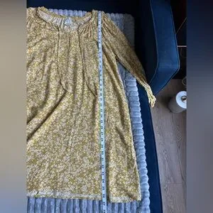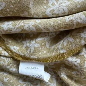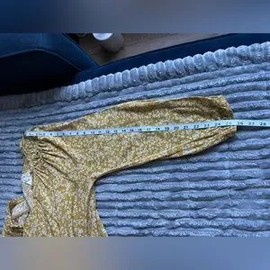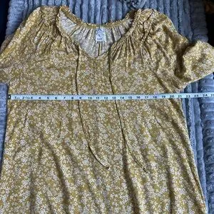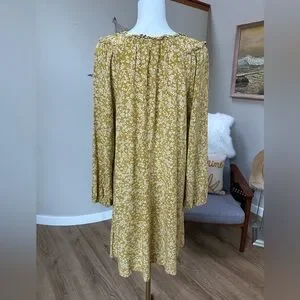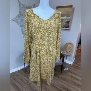 Romantic flowy v neck dress with tiny floral print of white on mustard yellow background. Tiny subtle ruffle detail on neckline. Wear with belt and cowboy boots or straight with wedge sandals. SZ XL although could fit other sizes depending on fit desired. Please confirm measurements approximate laying flat in pictures as Poshmark does not accept returns for fit issues. Please scroll to see all eight photos provided.