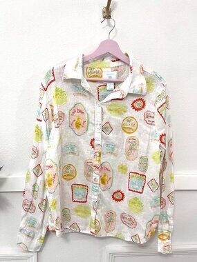 This women’s olive oil label print button-down shirt by Anthropologie features a charming vintage-inspired Mediterranean graphic pattern with colorful olive oil label illustrations throughout. The design showcases playful label motifs in soft shades of green, red, yellow, and pastel tones against a light ivory or cream background, creating a whimsical, travel-inspired aesthetic.