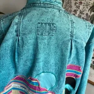 Vibrant turquoise denim jacket with colorful embroidery. Ideal for a bold fashion statement.