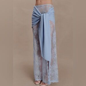 Elegant light blue lace maxi skirt with a draped tie detail. Sheer floral lace creates a delicate, feminine look. Soft draped overlay adds movement and a modern silhouette. Versatile piece for dressed-up occasions.