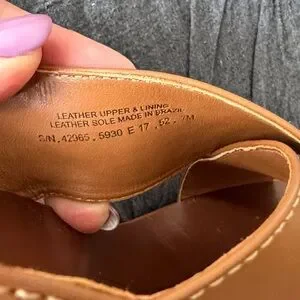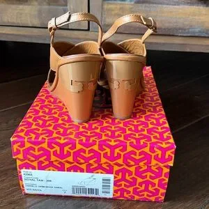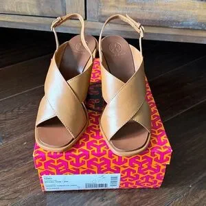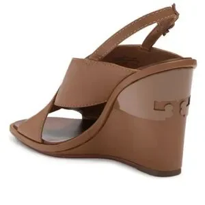 Beautiful leather wedge sandals with slingback buckle straps. Royal tan color. Enameled metal logo on the back heel. Leather upper, lining and outsole. Approx 3.75” heel. Size 7 . In excellent condition. Worn once. Please see the pictures.