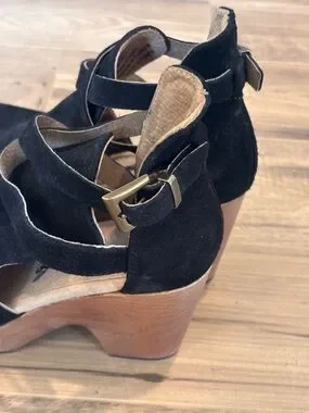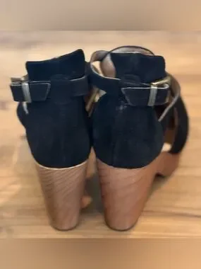 • Material: Suede upper, wooden platform/heel