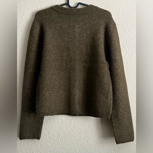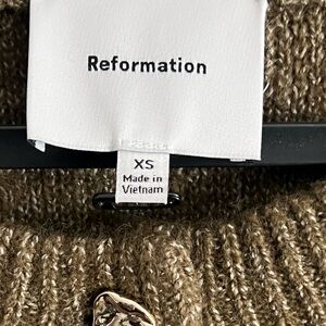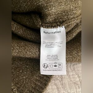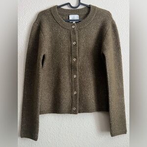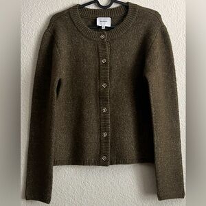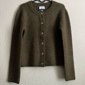 Soft knit Reformation cardigan with classic silver button front. Crew neckline and long sleeves. Subtle textured finish. Versatile olive green hue. Never worn by me, unfortunately not my style but a great sweater.