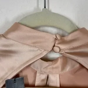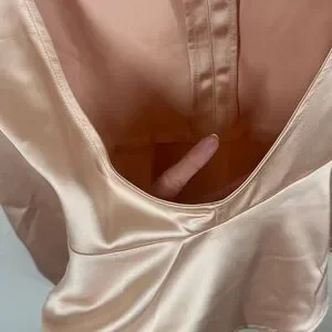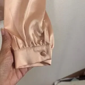 Lulus Satin blouse. Open back detail for a bold look. Soft peplum flair at hem. Button closure at neck. Feminine and chic. Approximate measurements laying flat: Length 22 inches, chest 16 inches, sleeves 24 inches. Manufacturing size small.