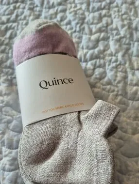 Comfortable cotton blend ankle socks by Quince. Low-cut design for a subtle fit. Soft, breathable knit with light stretch. Neutral heather gray body with a pink toe accent.