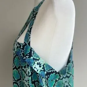 Bold BCBG Max Azria snake print cami top in vibrant turquoise tones. Flowy silhouette with an asymmetrical hem that moves beautifully and flatters without clinging.