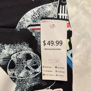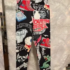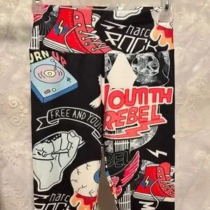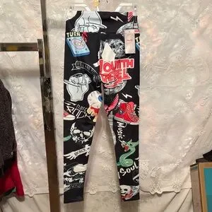 Bold black kids leggings with colorful punk-inspired graphics. Comfortable stretch fabric for all-day wear. Eye-catching red, white, green and blue prints add playful attitude. Easy to pair with tees for an on-trend look.