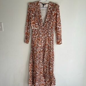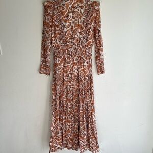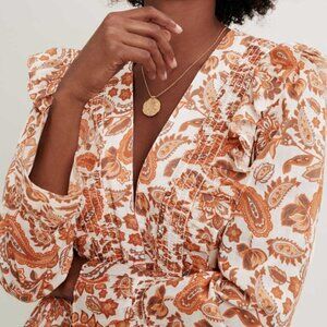 Long, loose dress with fitted waist. Long, loose sleeves with ruffles at the bottom. Paisley print cotton. Cotton skirt lining. Ruffles on the neckline. Elasticated waistband. V neckline.
