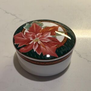 Decorative Mikasa serving plate. Features a large red poinsettia with green leaves. Gold rim and accents add elegance. Vibrant holiday motif. Ideal for seasonal table display.