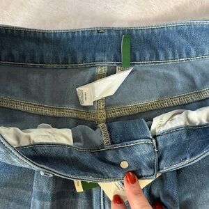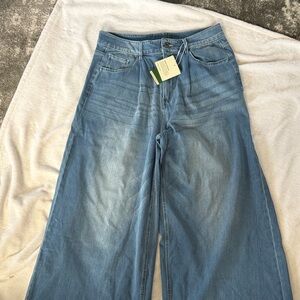 Soft light blue denim with a wide leg silhouette. High-rise waist for a flattering fit. Gentle fading for a lived-in look. Versatile style for casual outfits.