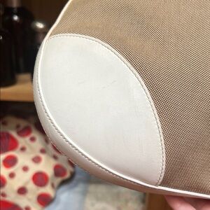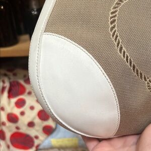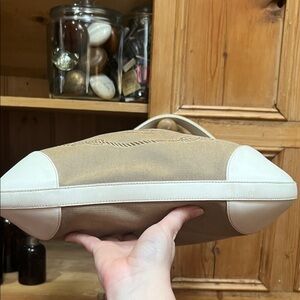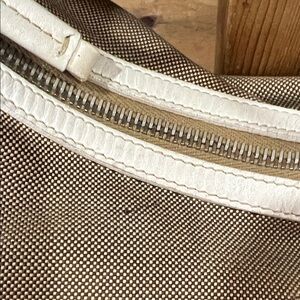 Prada hobo bag in beige canvas with white leather accents. Embroidered Prada Milano logo on front. Single shoulder strap for easy carry. Clean, casual silhouette for everyday use. In good condition! A few small spots shown in pictures. Authenticity is pictured.