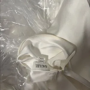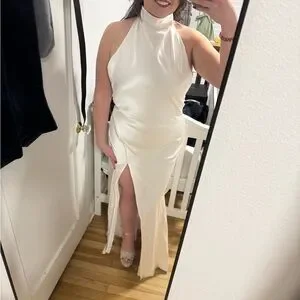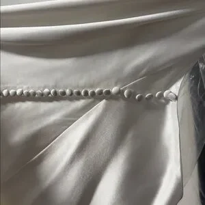 Worn once but does have spray tan rubbed on inside of halter and small yellow stain inside skirt of dress (pictures of both). Will come out once dry cleaned! Great condition otherwise. Only alteration is buttons added to end of back (also pictured)