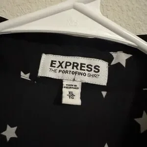 Express Portofino Shirt showcases a classic button-down silhouette with a playful celestial twist. Crafted from a lightweight, semi-sheer fabric, this long-sleeve blouse features a crisp white star print against a deep black background. The design includes a pointed collar, a full button front, and adjustable roll-tab sleeves for versatile styling. Dual chest pockets add a touch of utility to this polished yet whimsical piece, making it an ideal choice for transitioning from office hours to evening outings.