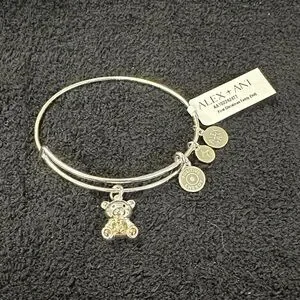Alex and Ani expandable bangle with a teddy bear charm. Includes signature positive energy and brand disc charms. Lightweight design for daily wear. Charming two-tone finish adds playful detail.