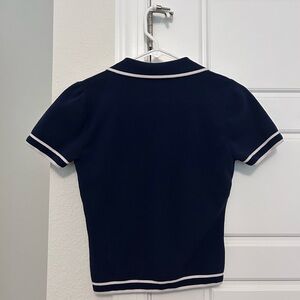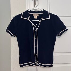 Navy knit short sleeve top by Bailey 44 (purchased at TJ Max) White contrast trim along collar, placket, sleeves, and hem. Pearl-look buttons down the front. Simple, polished silhouette. Thick material. Only worn once!