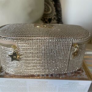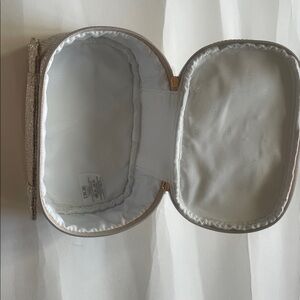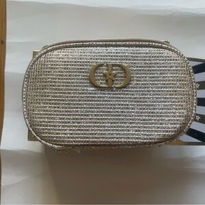 Compact Dior cosmetic case in shimmering gold weave. Features gold-tone emblem and zipper.