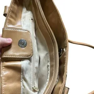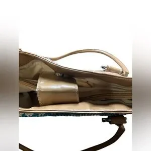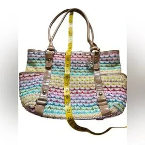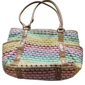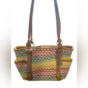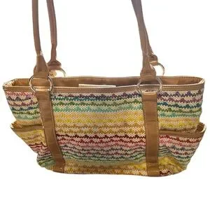 Woven Multicolor Straw Tote Bag Tan Faux Leather Handles Shoulder Purse