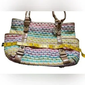 Bright and fun woven tote bag with multicolor pattern and tan faux leather straps ✨ Perfect for spring/summer outfits, beach days, or everyday casual use.
