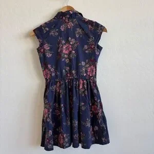 This Arizona Jean Co. dress features a classic button-front design with a flattering gathered waist. The dark navy fabric is accented with a vibrant pink and red floral print, perfect for a cottagecore or western-inspired look. Includes functional chest pockets and a structured collar